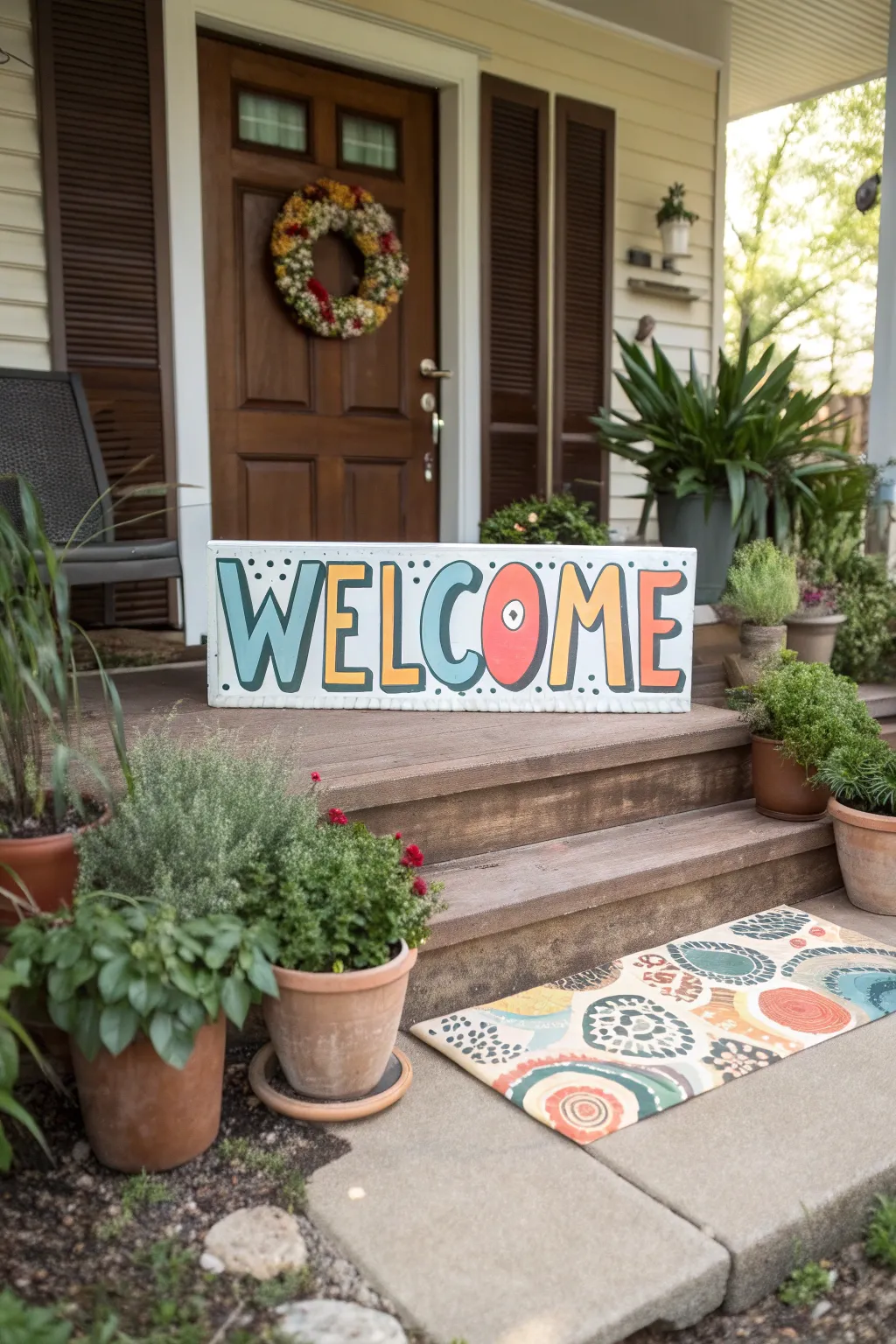 - Neutral Welcome Sign with Seasonal Accents: Update your porch with a neutral welcome sign featuring colorful seasonal accents for year-round style.