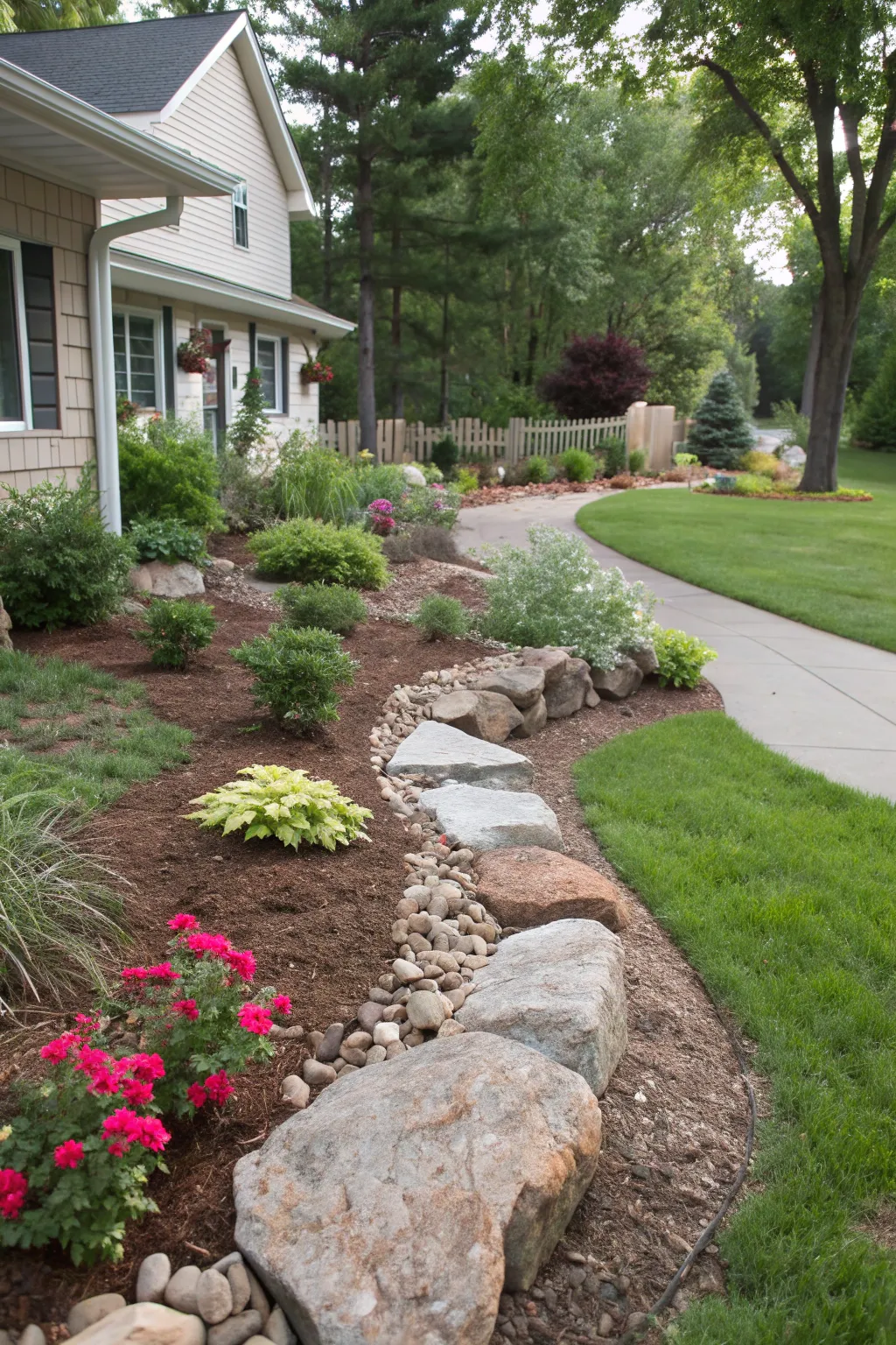 Use rocks to create a charming pathway through your front yard, with mulch providing an earthy contrast. Many of my clients appreciate how this design invites guests to explore their garden with a sense of wonder.