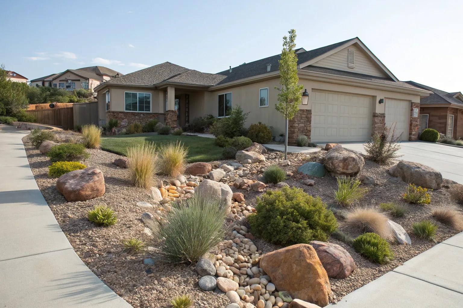 Incorporate a rock garden using local stones to add texture and visual interest without needing water. I once worked with a client who was thrilled with how the rocks highlighted their succulents and grasses.