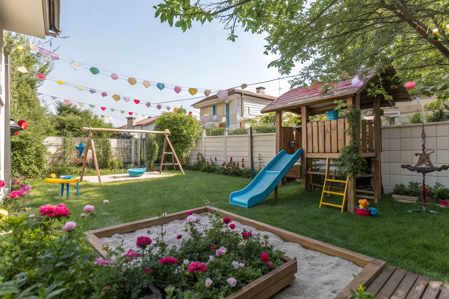 Add a musical garden with wind chimes, drums, and xylophones for a symphony of sounds. Kids can create their own concerts and explore the magic of music outdoors.