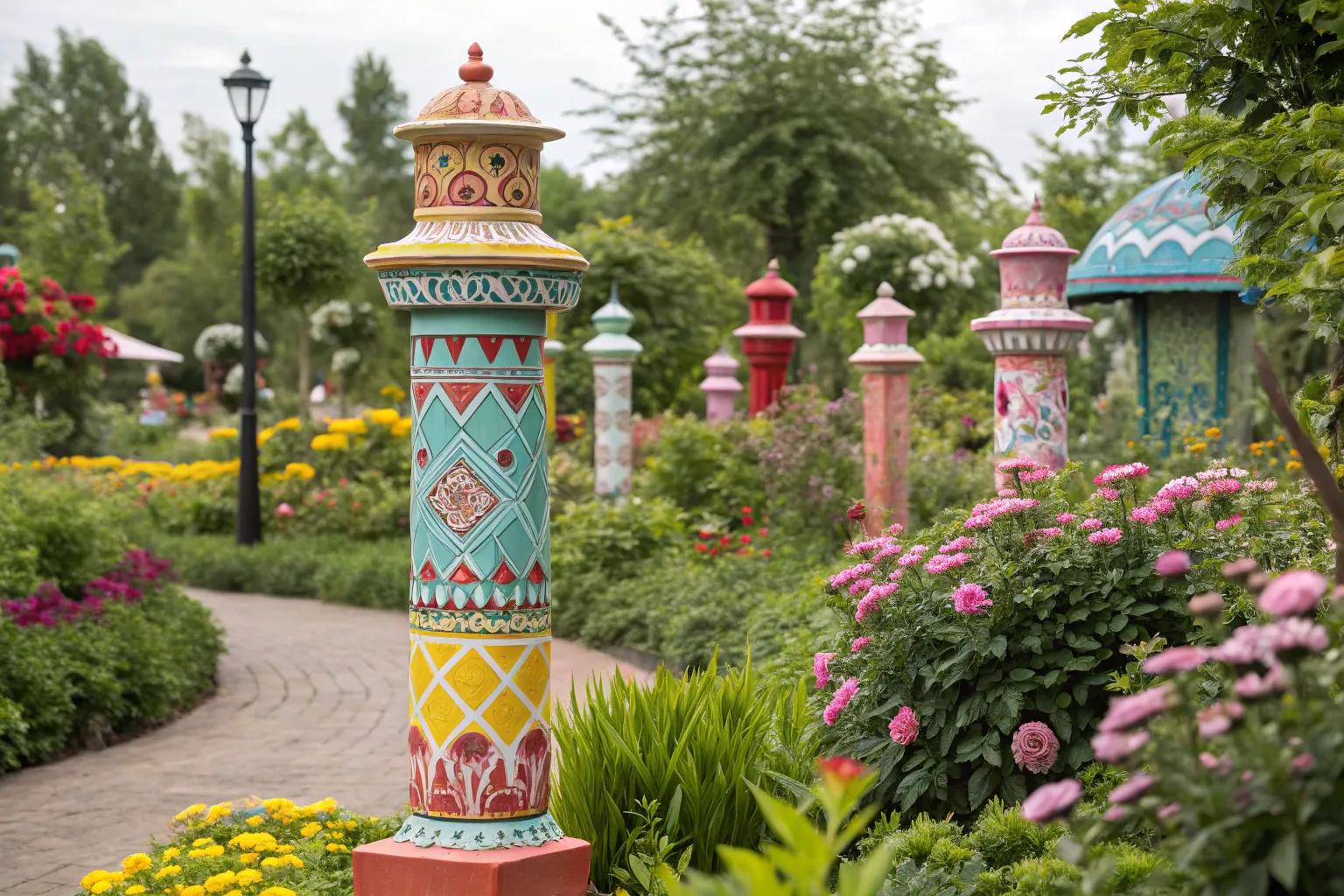 Imagine a row of colorful totem poles standing proudly in your garden. These can be painted with vibrant patterns for a pop of color that lasts all year round, just like the ones I often craft in my garden studio.
