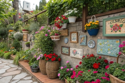 An old window frame can work wonders as a decorative backdrop for your garden wall. I’ve seen clients add small pots to the panes, filled with herbs or succulents, creating a rustic, charming look.