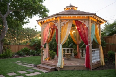 Add a splash of colorful fabrics to your gazebo by hanging drapes in vibrant hues. I once hosted a summer soirée with pink and orange drapes, and the effect was simply magical!