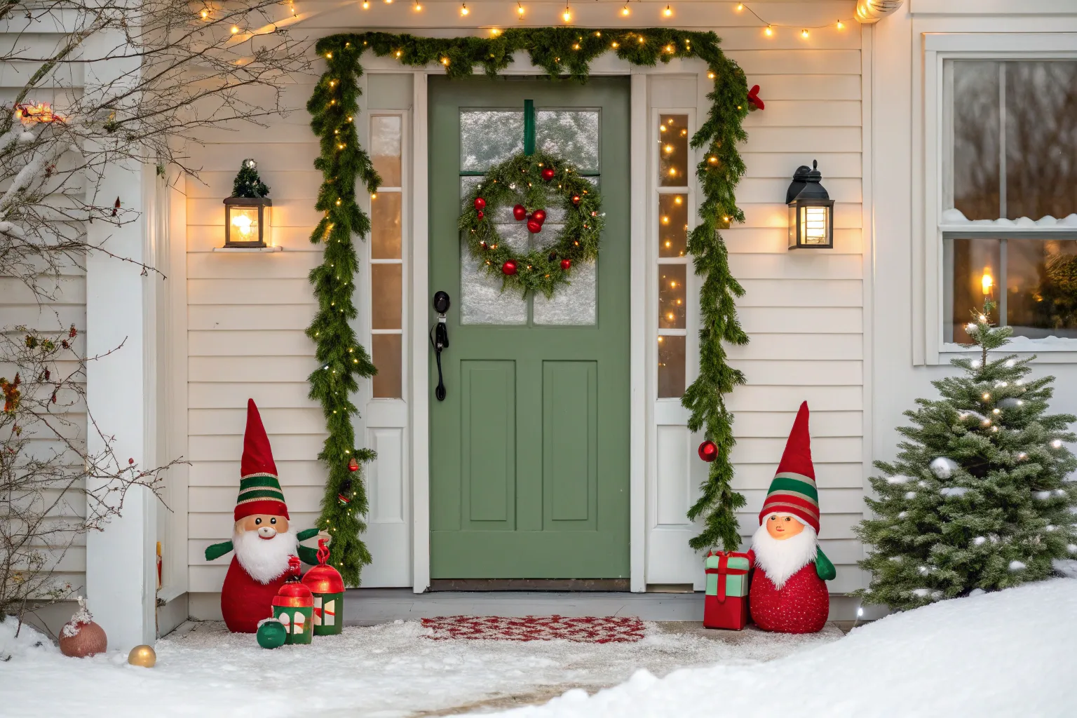 Drape a garland intertwined with tiny gnomes around your doorframe. This delightful mix of greenery and whimsy is sure to catch your neighbor’s eye.