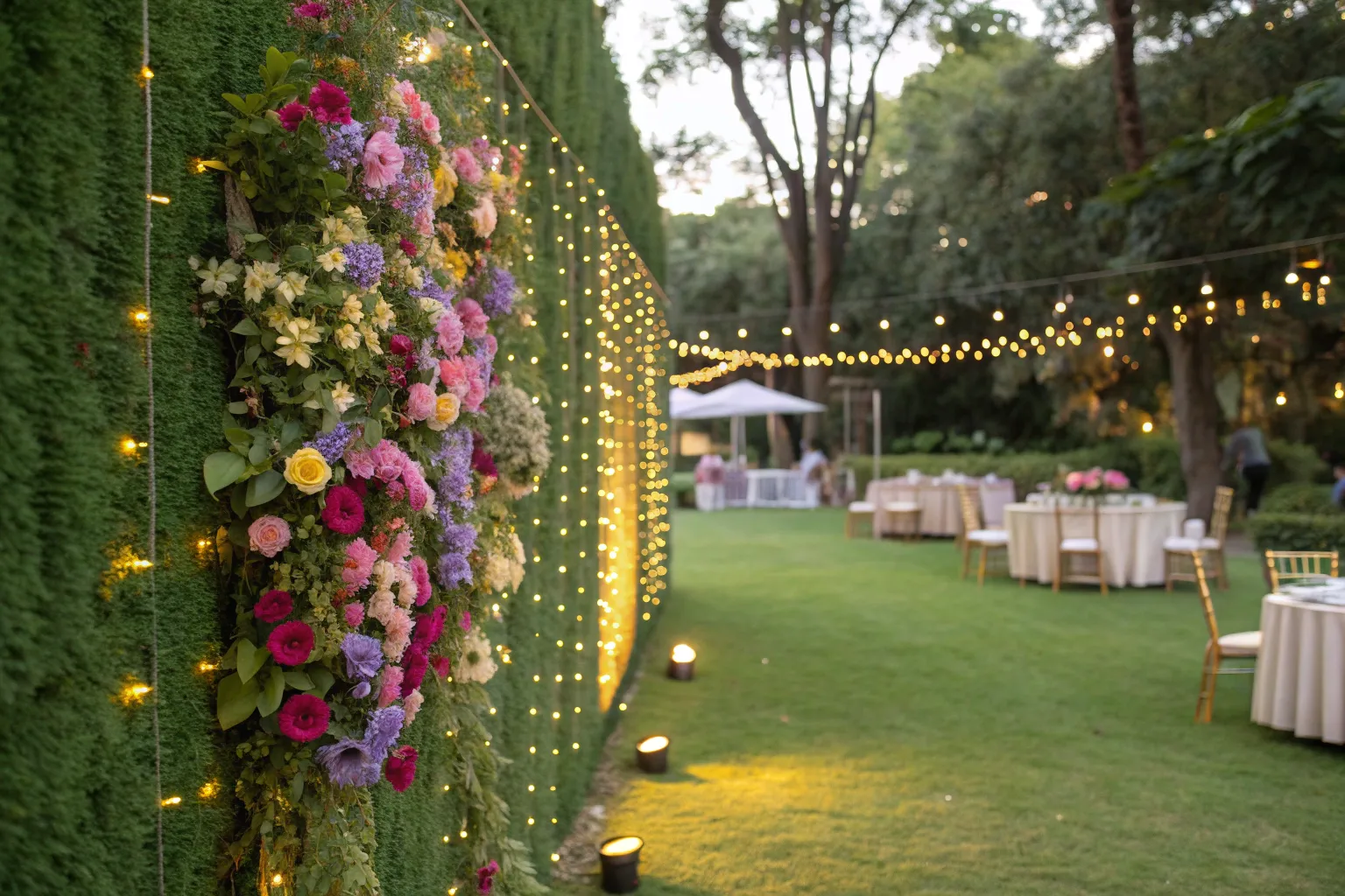 Transform your backyard into a whimsical garden party with a grass backdrop draped in fairy lights and vibrant blooms. Trust me, the enchanting glow and pops of color will leave your guests in awe.