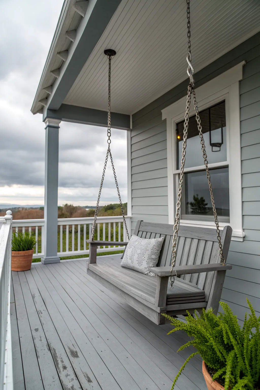 A porch swing painted in gray is both charming and relaxing. It’s a favorite addition for many of my clients who love leisurely afternoons.