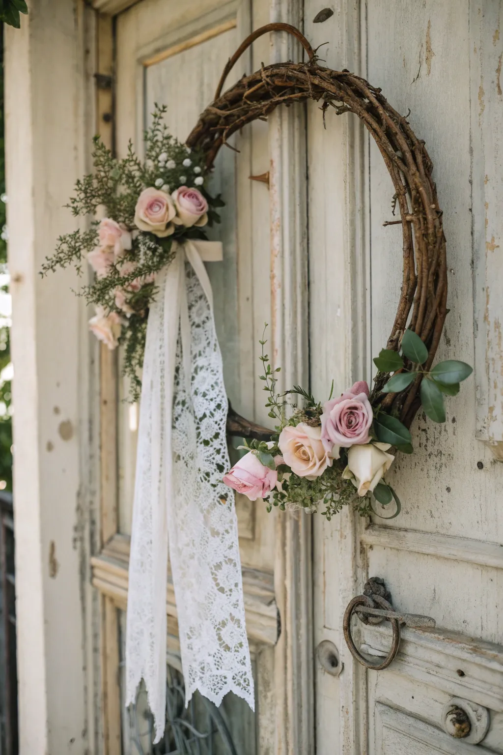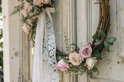 Channel vintage vibes with roses and lace. This romantic wreath is ideal for adding a touch of nostalgia to your decor.