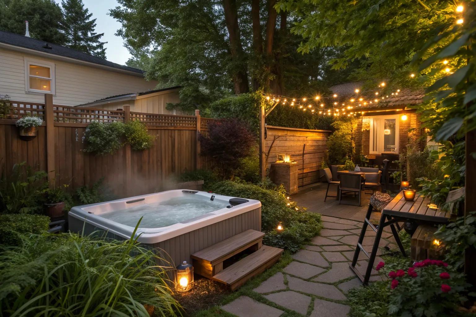 Create a secluded oasis using privacy screens or pergolas around your hot tub. I’ve seen beautiful results with bamboo screens that blend seamlessly with nature.