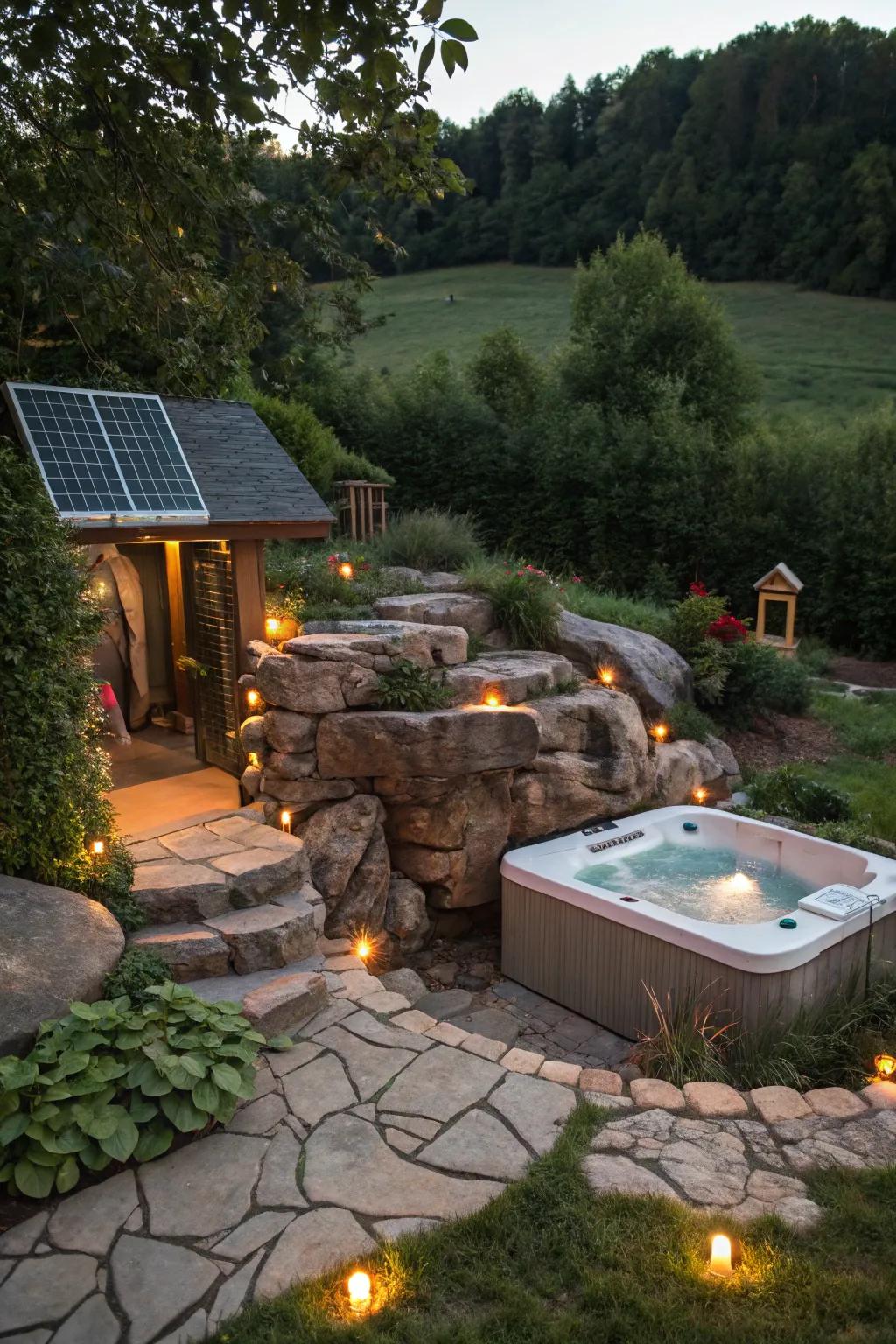 - Solar-Powered Garden Lights: Illuminate your hot tub grotto sustainably with solar-powered lights, enhancing ambiance while conserving energy.
