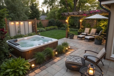Add plush outdoor seating around your hot tub for ultimate comfort. My guests love sinking into the cushions after a soak.