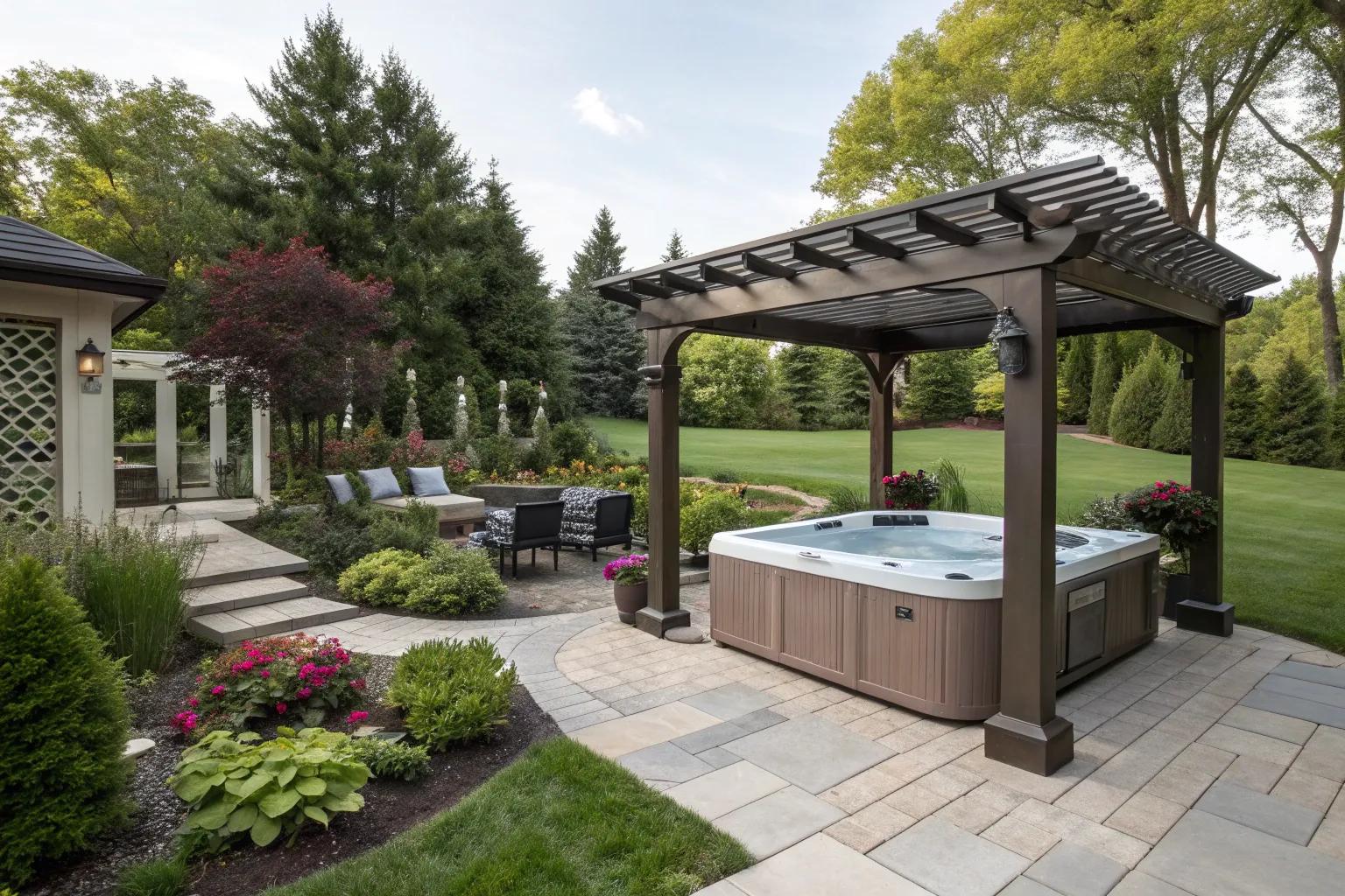 For protection from the elements, consider a weather-proof pergola with a full roof. This option is great for enjoying your hot tub year-round.