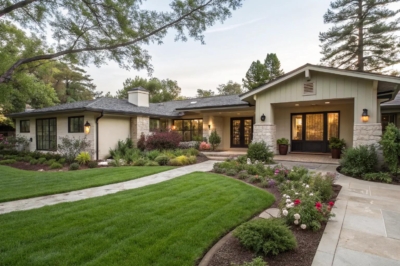 Consider adding vertical elements like tall shrubs and trees to break up the ranch’s horizontal lines. I’ve seen clients achieve stunning results with layered plantings that add depth and color.