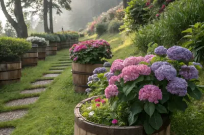 Old wooden barrels make excellent hydrangea planters, offering a rustic and robust option. I love how they blend seamlessly into natural settings.