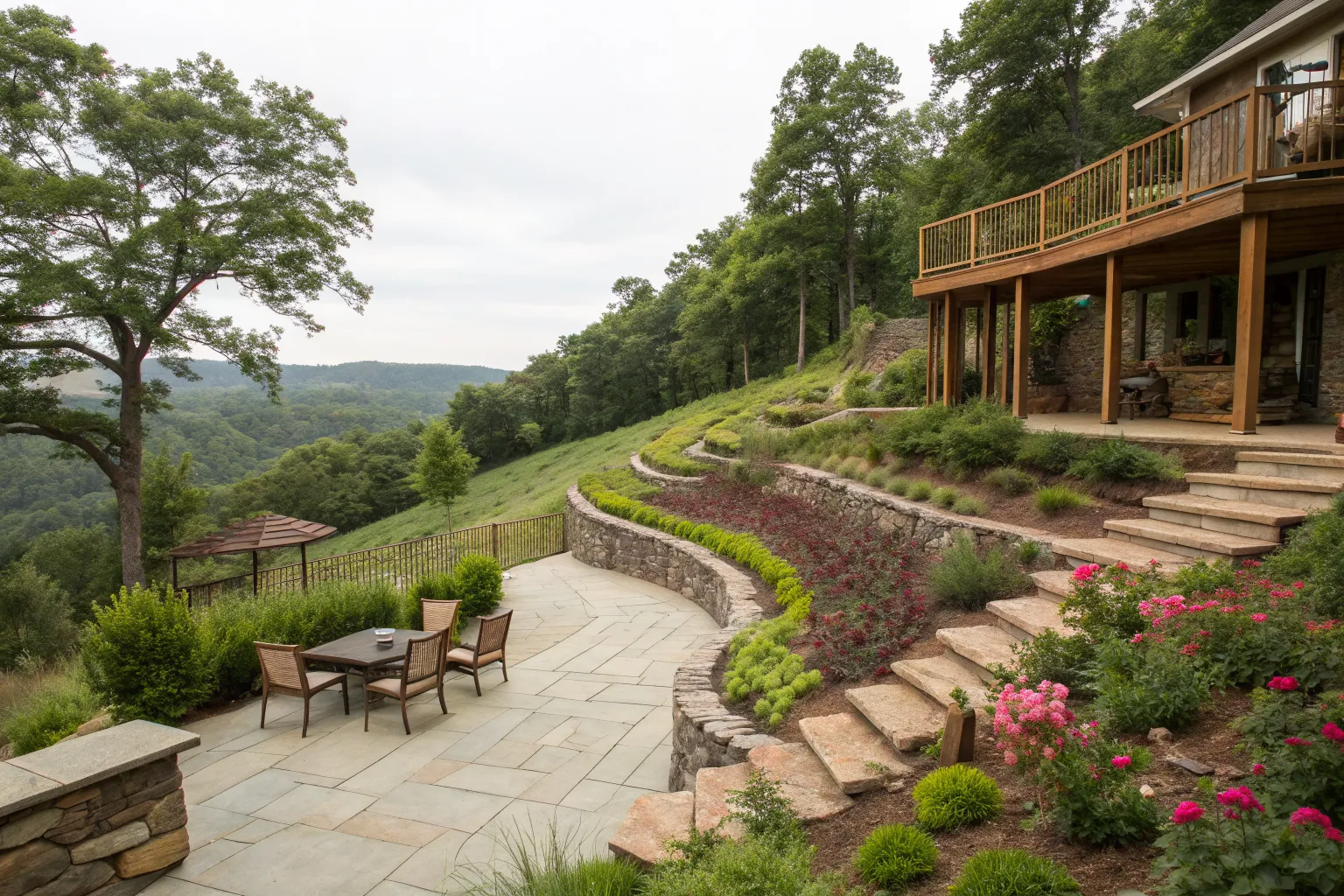 A natural stone retaining wall can beautifully define your patio space while managing the slope. It’s a classic solution that enhances any garden setting.
