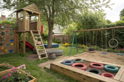 A simple climbing wall made from plywood and colorful climbing holds can provide hours of fun and exercise for the kids. In one of my projects, we added a splash of paint to match the garden flowers, making it both a play structure and a visual delight.