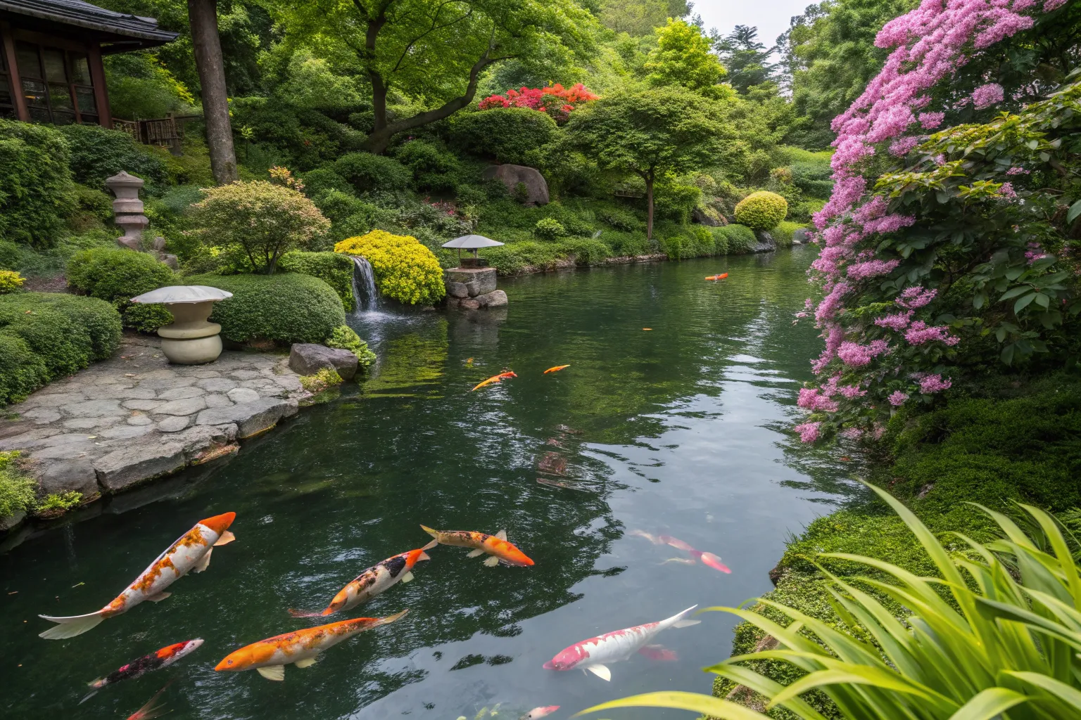 Blend your koi pond seamlessly into your garden with natural stones and lush greenery. In my experience, this approach creates a calming, organic atmosphere that feels like a hidden retreat.