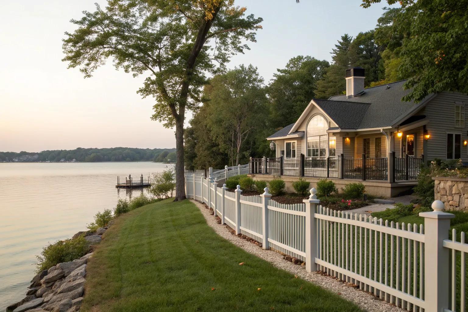 A classic picket fence provides timeless charm and blends seamlessly with the tranquil lakeside environment. I’ve often recommended this to clients who love its quaint appeal and unobstructed views.