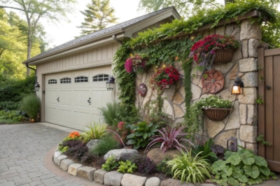 Incorporating decorative rocks and boulders along the base of your garage wall can create a striking focal point. I’ve seen this technique work wonders in clients’ gardens, adding both texture and structure.