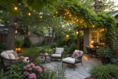 Transform a corner into a private garden haven with tall trees and a pergola. This creates a serene space for quiet reflection or reading.