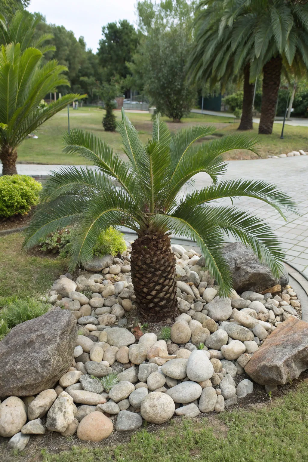 Incorporate rocks around your pygmy date palm for added texture and interest. This low-maintenance setup is perfect for a modern aesthetic.