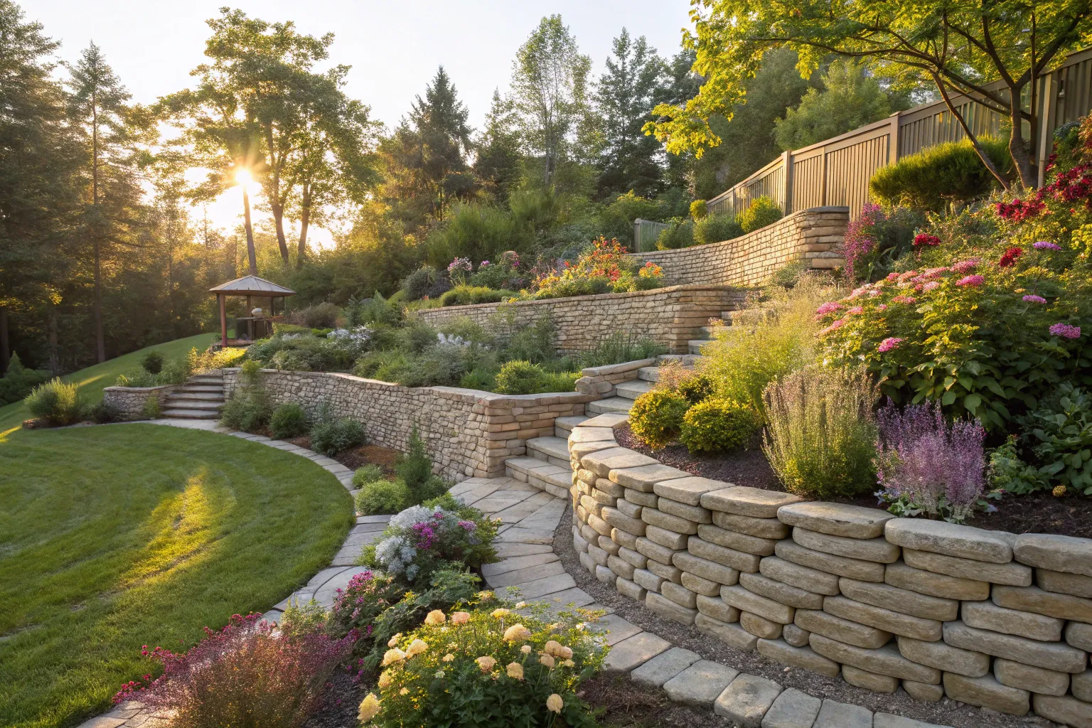 Incorporating curved stone walls into your landscape is a fantastic way to embrace the natural lay of the land. I’ve used this method to create a flow that feels organic and effortlessly chic.