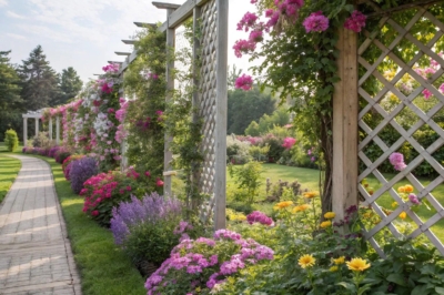 Create a stunning garden backdrop by installing lattice panels and letting climbing plants weave their way through. I’ve seen many clients’ gardens come alive with this simple yet effective approach, adding layers of color and texture.