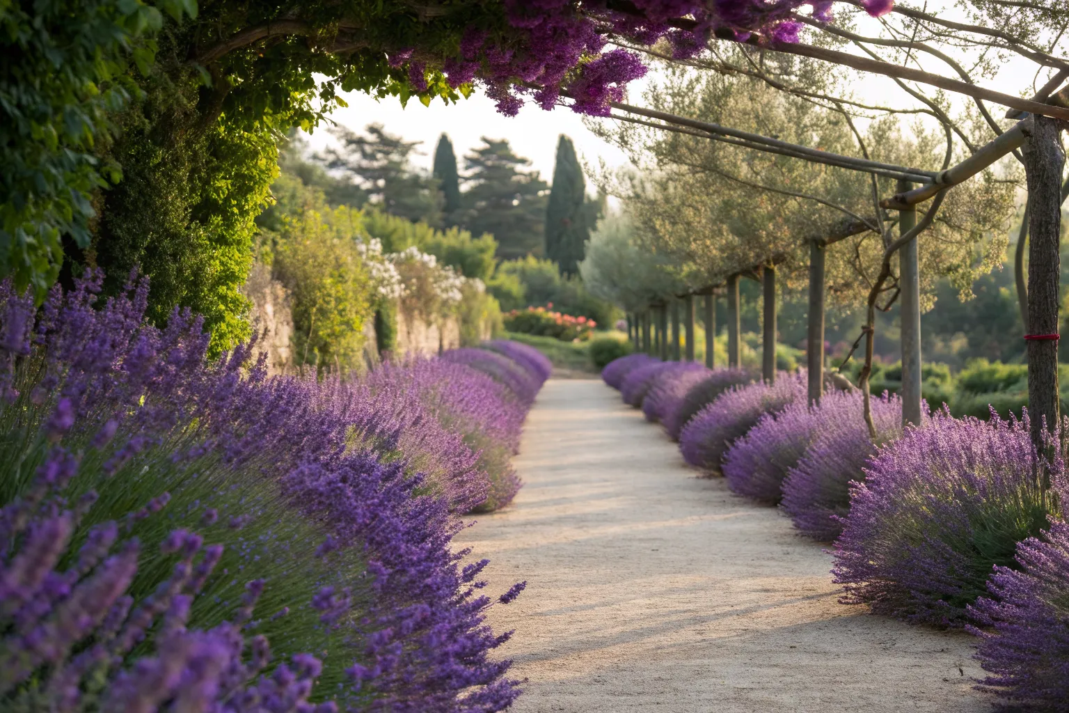 Craft a Mediterranean vibe by pairing lavender with olive trees and terracotta pots. This setup transports you straight to a sunny Italian villa.