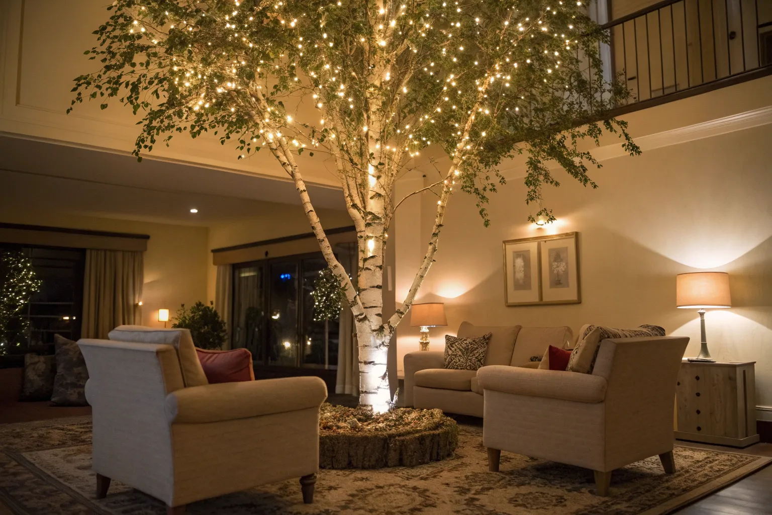Place a lighted birch tree in the corner of your living room to create a cozy reading nook. I once did this for a client, and it quickly became their favorite spot to unwind.