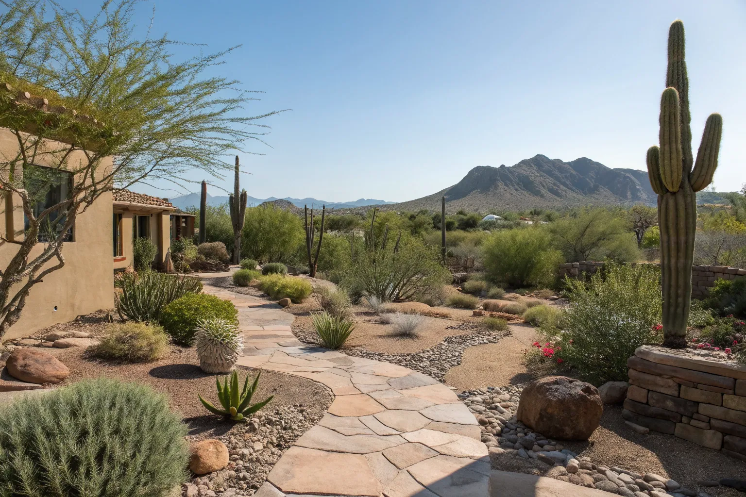 - Natural Stone Pavers: Incorporate natural stone pavers to enhance your backyard’s seamless desert landscape integration.