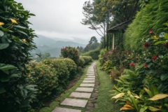 For shaded walkways, lush ferns create a magical, woodland feel. Their low-maintenance nature makes them a go-to choice for shady spots.