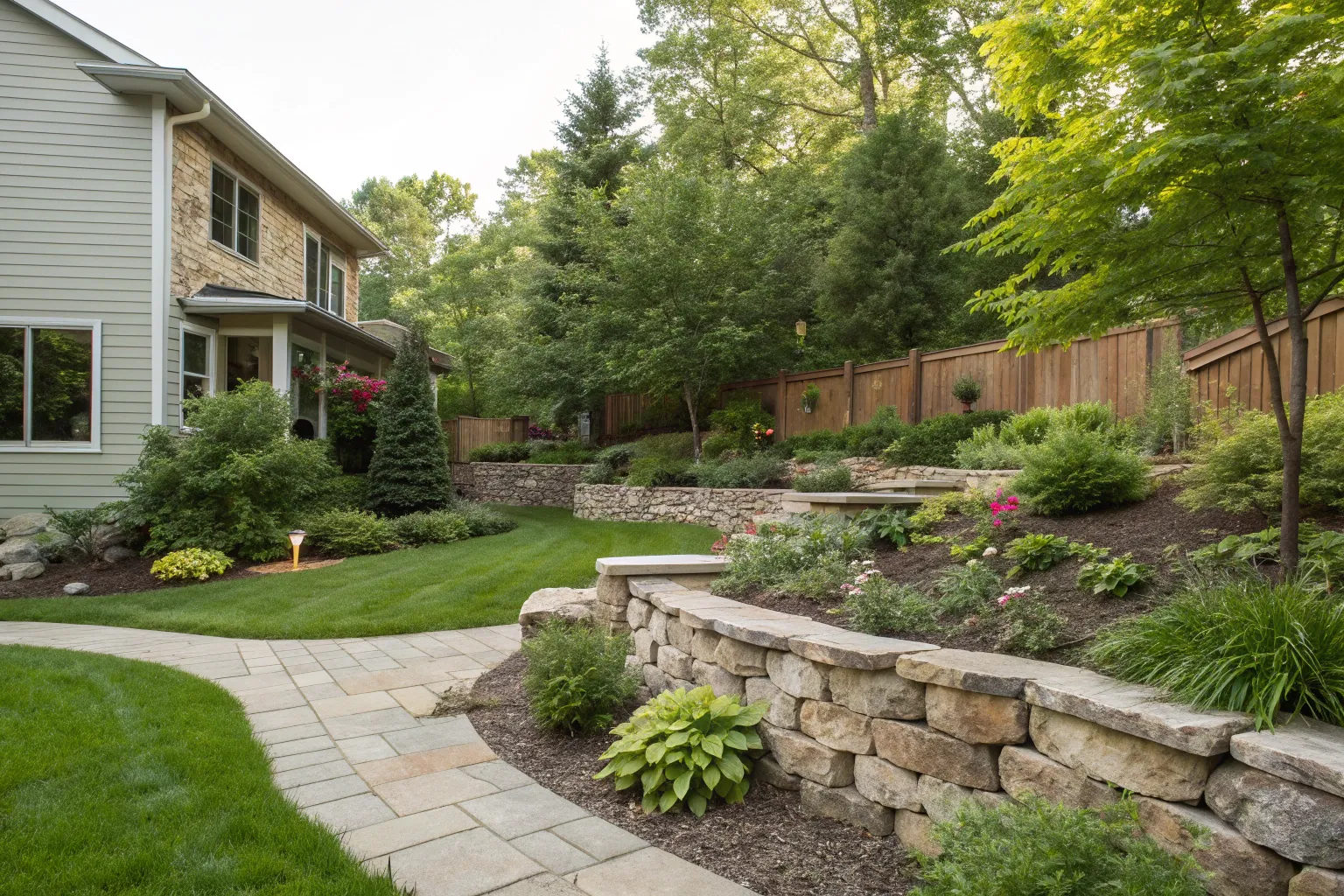 Creating a multi-tiered wall can transform a plain slope into an eye-catching showcase for plants. It’s a design I adore for adding dimension and interest.