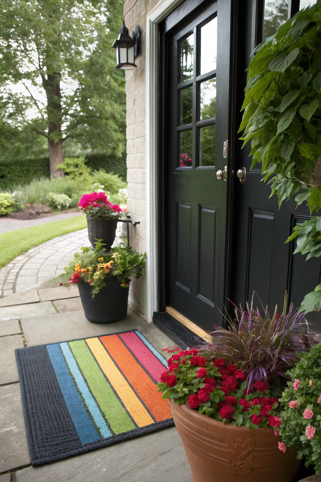 Add a pop of color with bright accents like a vibrant doormat or painted pots. A little color can brighten any entrance.