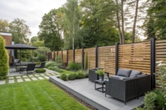 Horizontal wood slats bring a modern twist to traditional fences. I personally adore this design for its ability to visually expand small spaces, creating a seamless flow with natural surroundings.