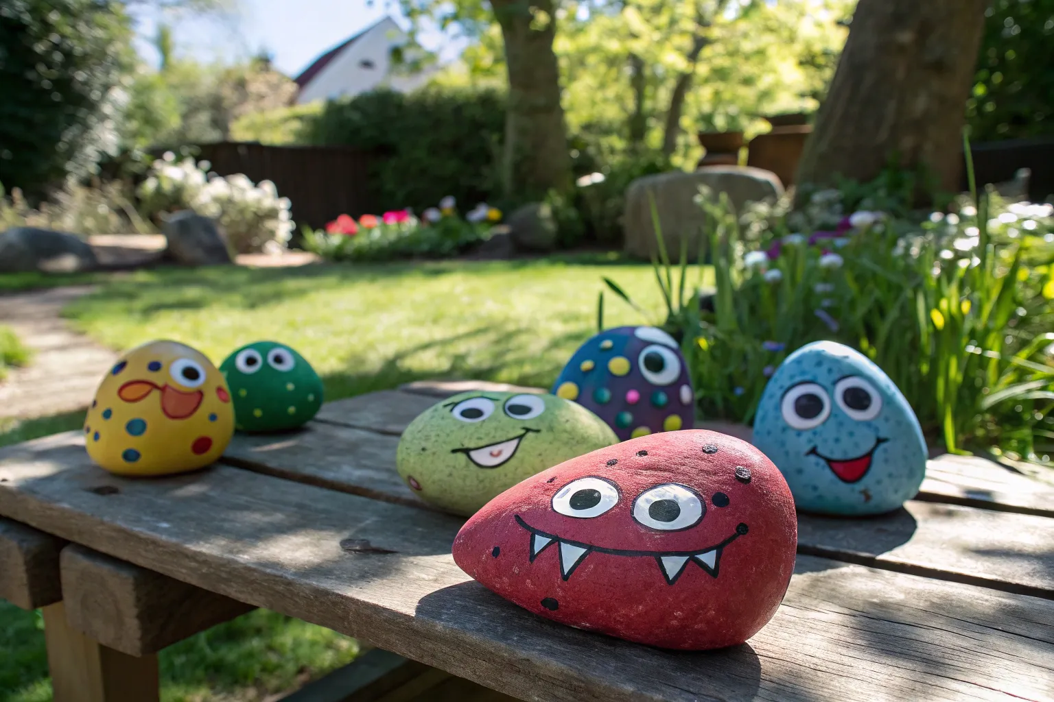 Create a family of monsters with different sizes and expressions. Each of my monster family rocks has its own personality and story, adding depth to my garden decor.