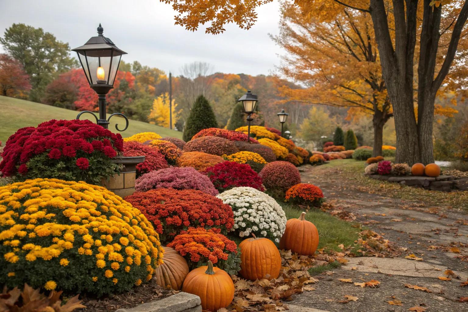 Mix different varieties of mums for striking color contrast. One client tried this and the result was a vibrant, eye-catching display that drew compliments from neighbors.