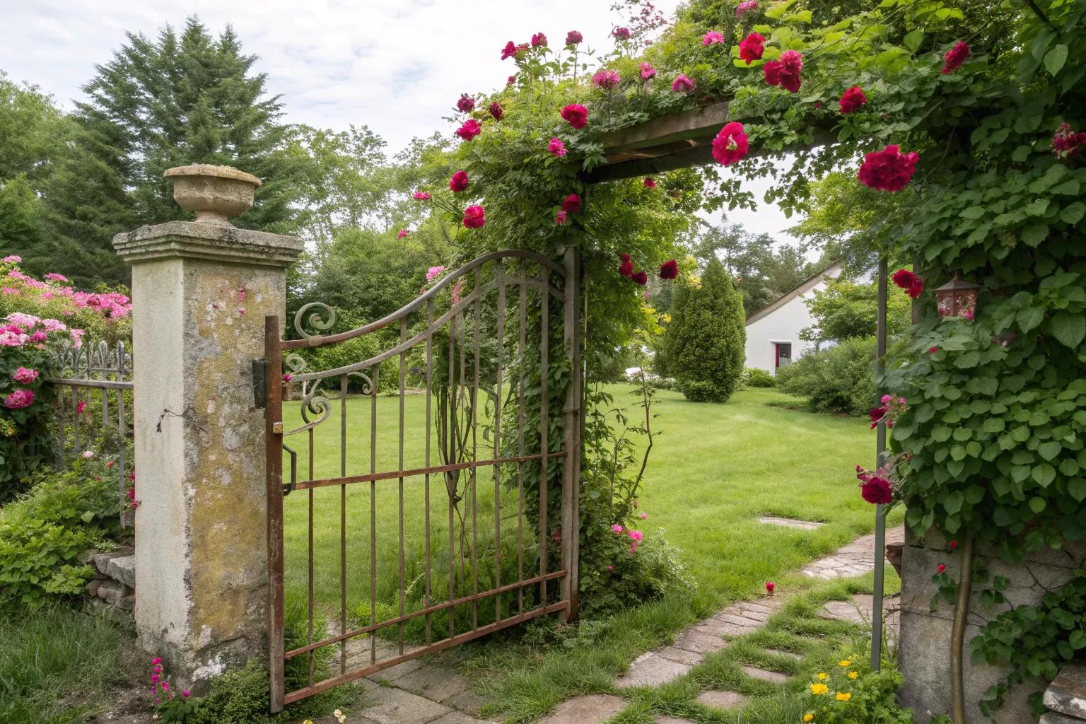 Let vines meander through the metalwork of your gate for an elegant, natural look. In my own garden, I’ve found that vines soften the hard lines of metal beautifully.