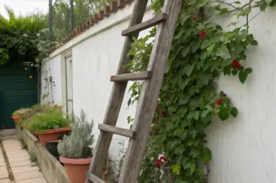 Repurpose a ladder as a garden trellis for climbing plants. In my garden, this setup supports my clematis beautifully, creating a vertical floral display.