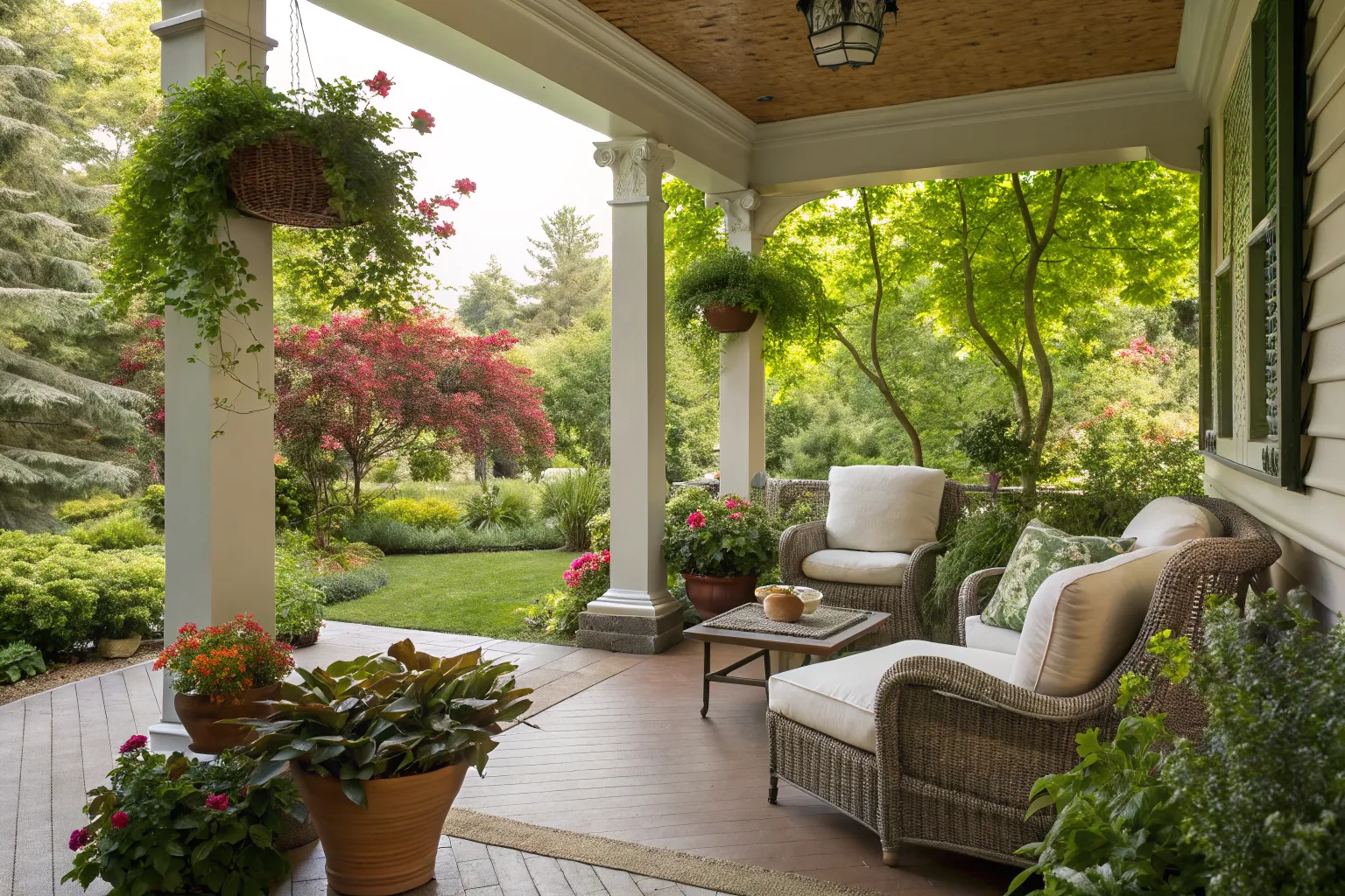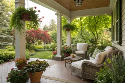 Frame your porch with a manicured garden. This lush surround not only elevates the space but also connects it seamlessly with nature.