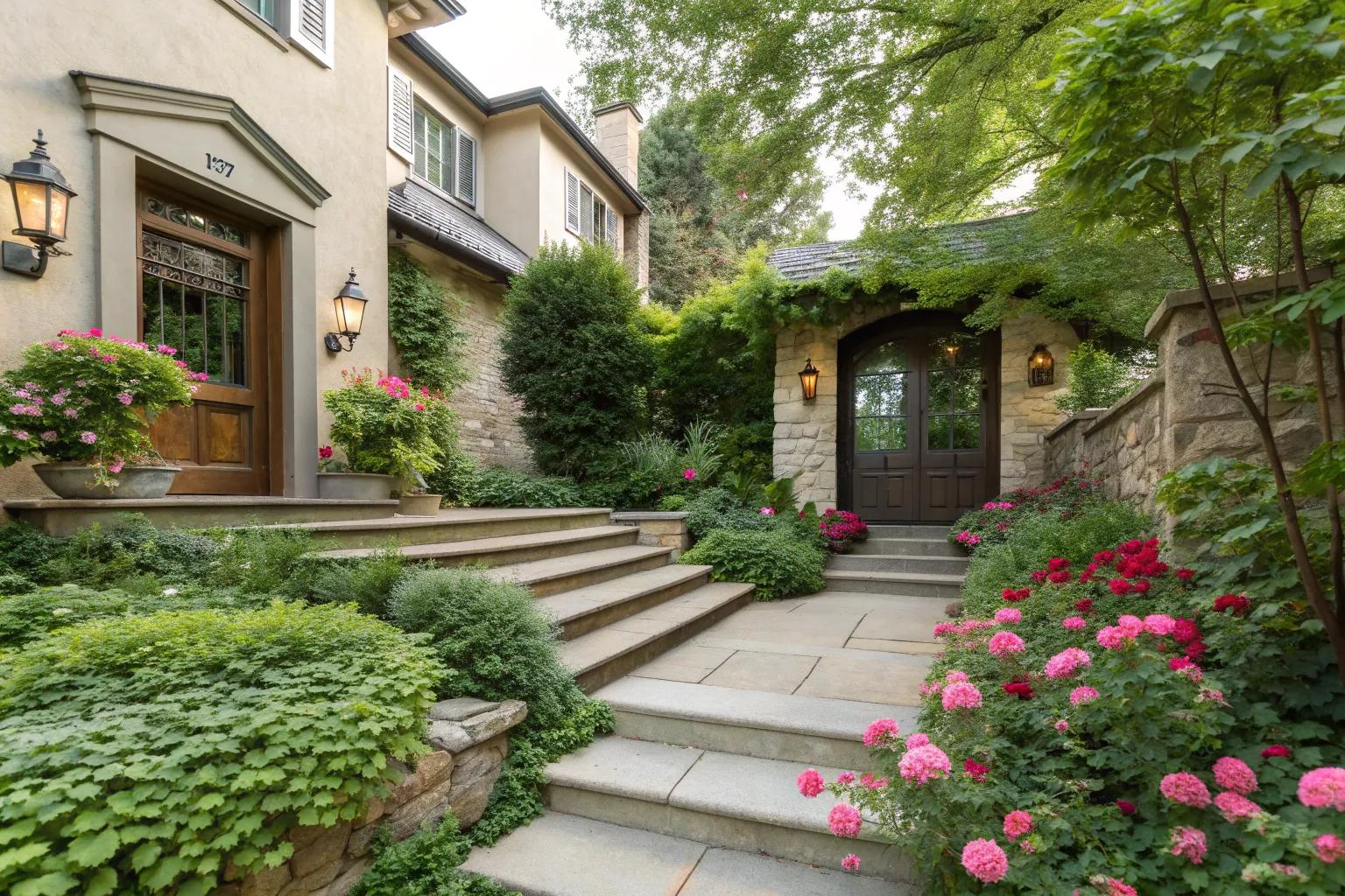 Integrate natural greenery by placing planters on each step. This lush approach not only softens the concrete but also brings life to the entrance.