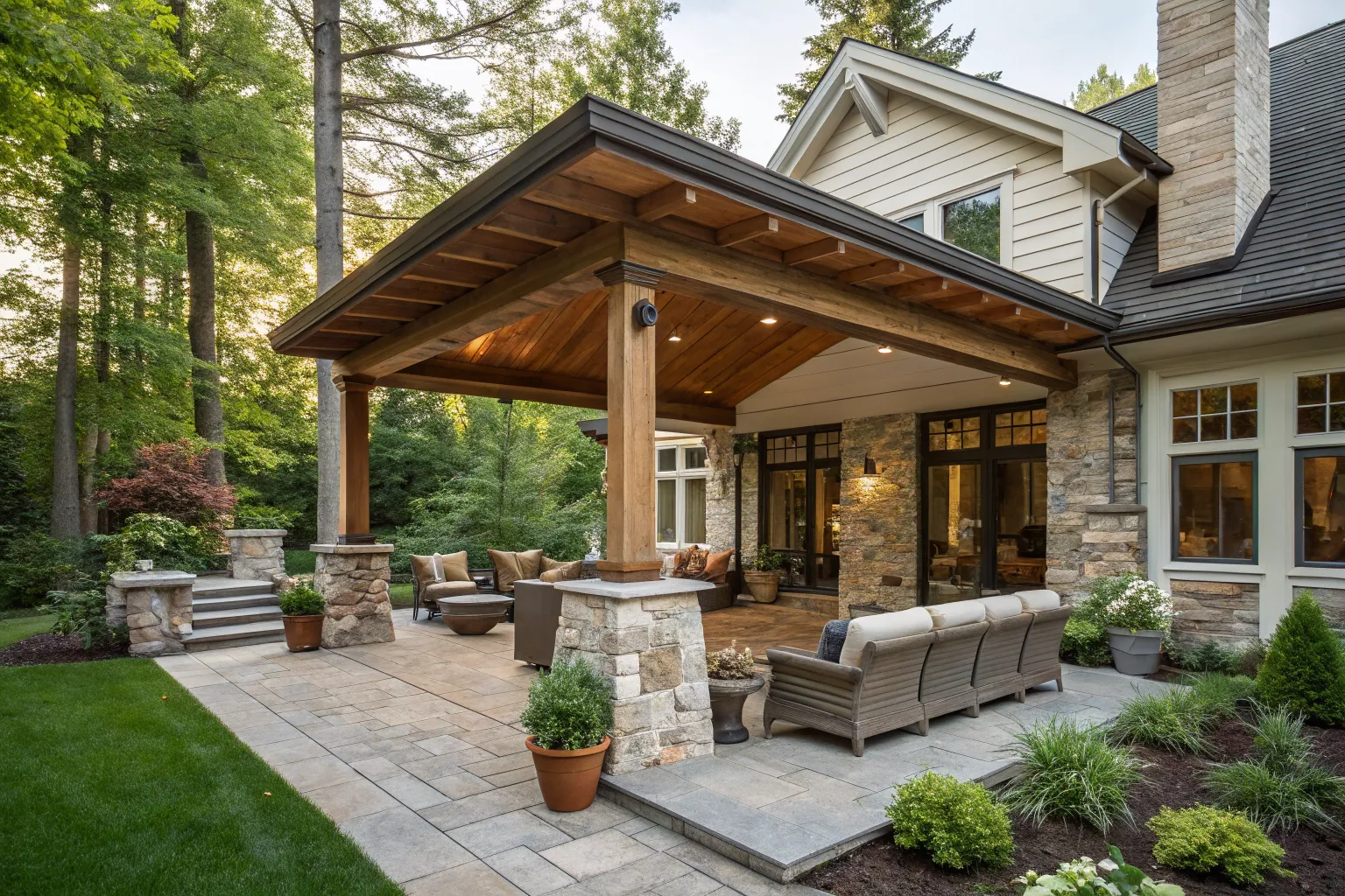 Embrace the beauty of rustic wood for a warm and inviting patio. Clients often choose wood for its timeless appeal and ability to blend with nature.