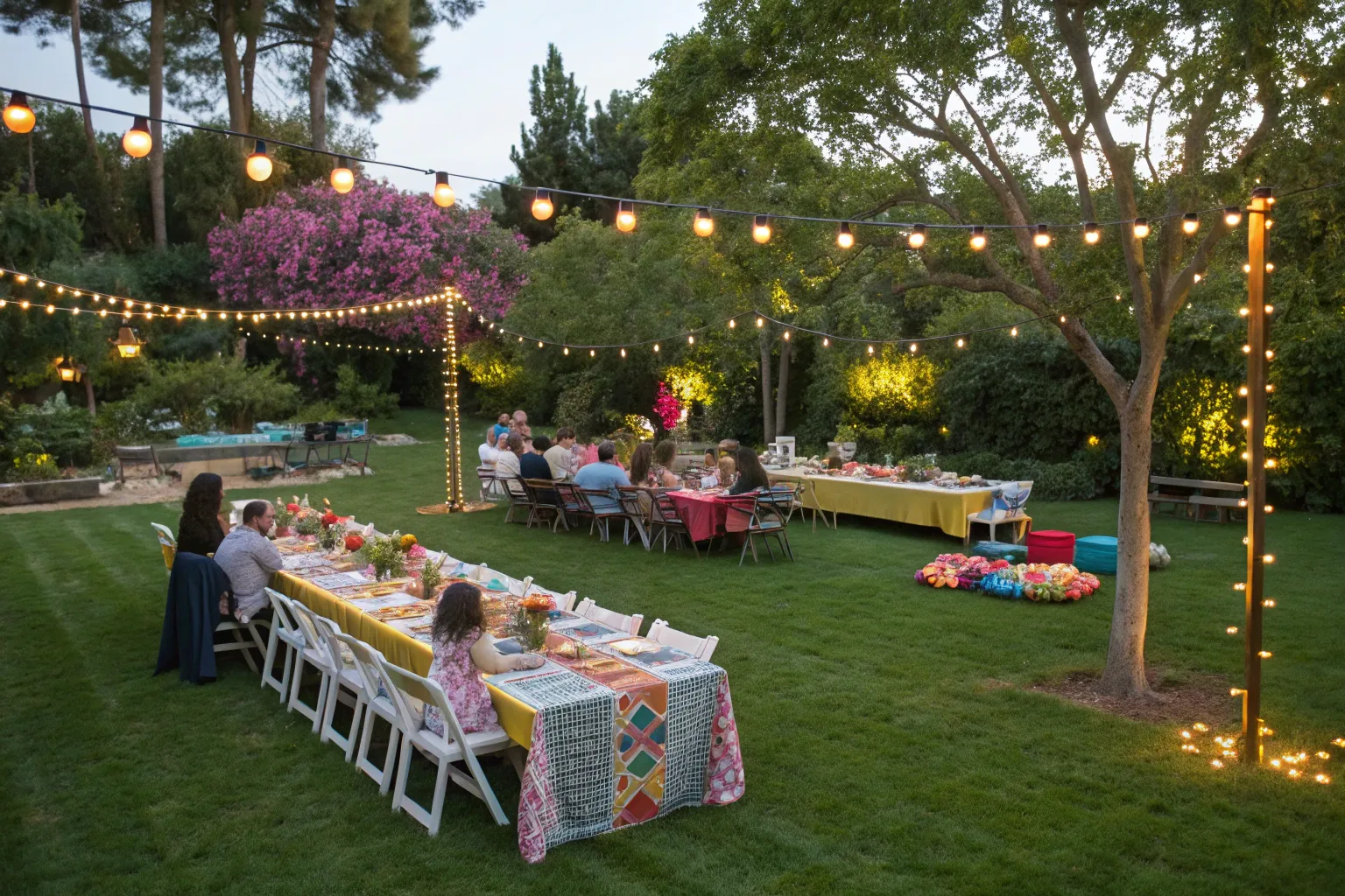 Lay out vibrant picnic blankets or area rugs, each with its own centerpiece. This defines cozy conversation nooks and adds a whimsical touch to the gathering.