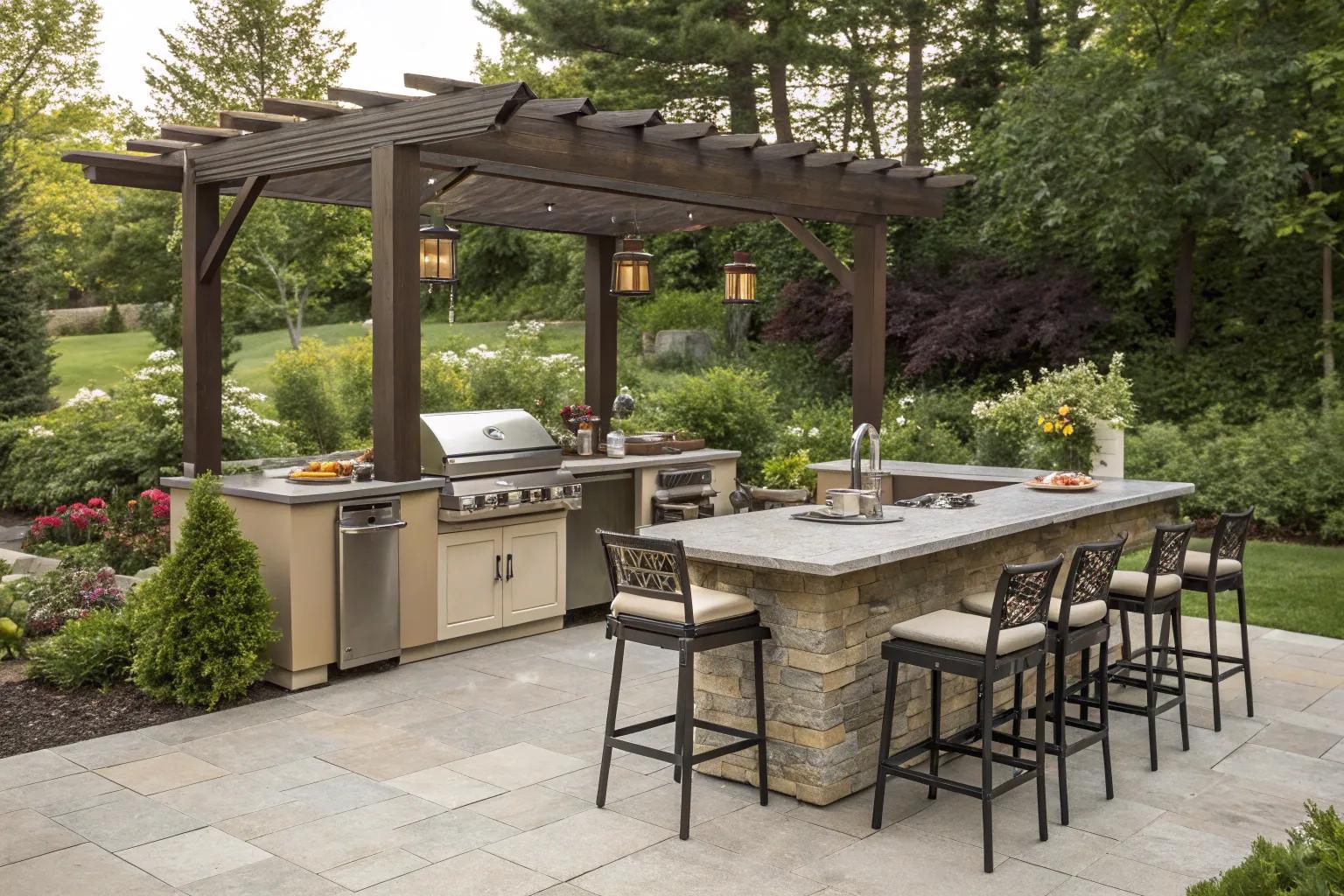 Consider adding a pergola to shelter your outdoor kitchen. It offers shade and creates a cozy ambiance, making your cooking area usable even in light rain.
