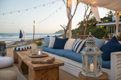 Transform your patio with a coastal seating area by incorporating blue and white cushions and a driftwood coffee table. In my own backyard, this setup always draws friends in for long chats over iced tea.