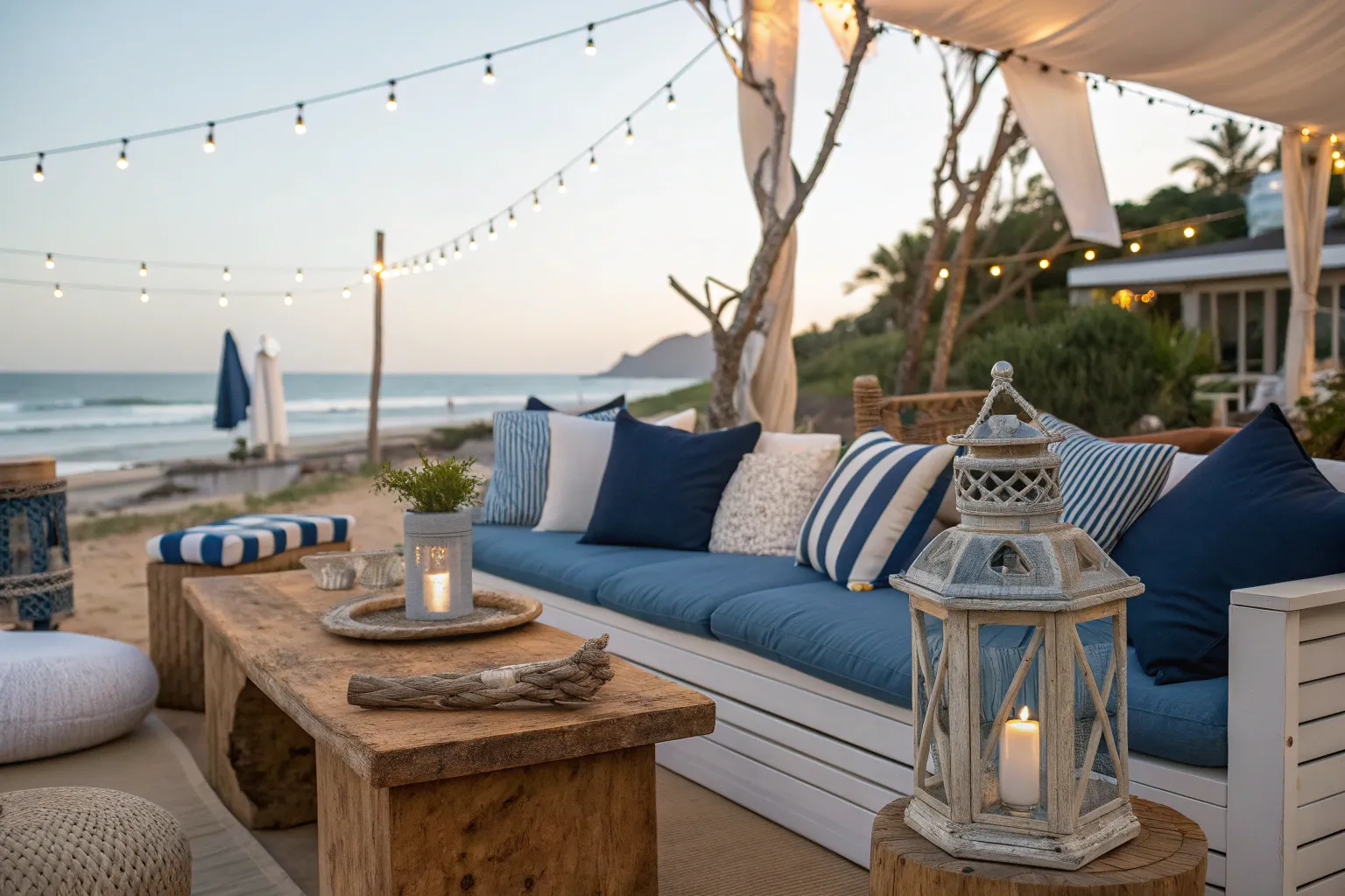 Hang coastal lanterns for ambient lighting that enhances the nautical theme. I often recommend these to clients for creating a cozy evening glow.