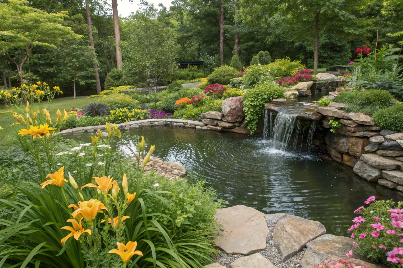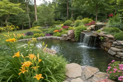 Surround your pond with lush landscaping for a natural, integrated look. I love how a mix of colorful flowers and greenery can elevate the entire space.