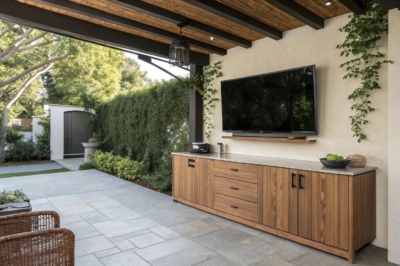 A wooden cabinet not only protects your TV but also adds a rustic touch to your patio. I’ve seen how clients love the warmth and charm it brings to their outdoor setup.