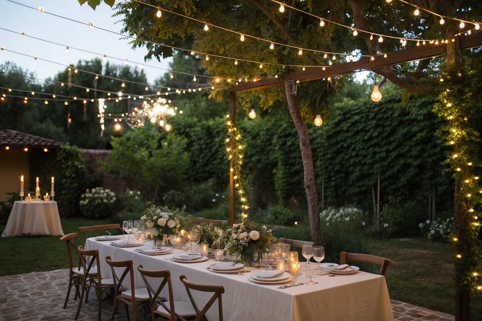 Drape string lights above your tables to create a romantic canopy of twinkling stars. I love how they transform an ordinary space into something magical at night.