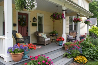 - Hanging Planters: Enhance your porch with hanging planters, adding vertical charm and green beauty effortlessly.