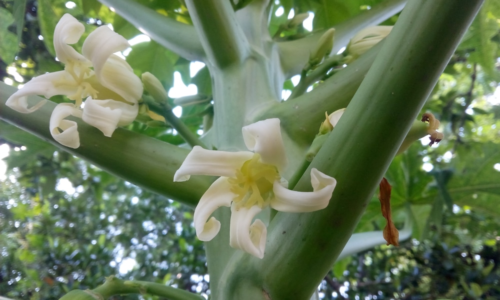 These flowers have both stamens that carry pollen and ovaries, so they’re self-pollinating. The flowers form on the leaf axils. Most papaya growers prefer hermaphrodite plants because they don’t need male or female plants to grow fruit.