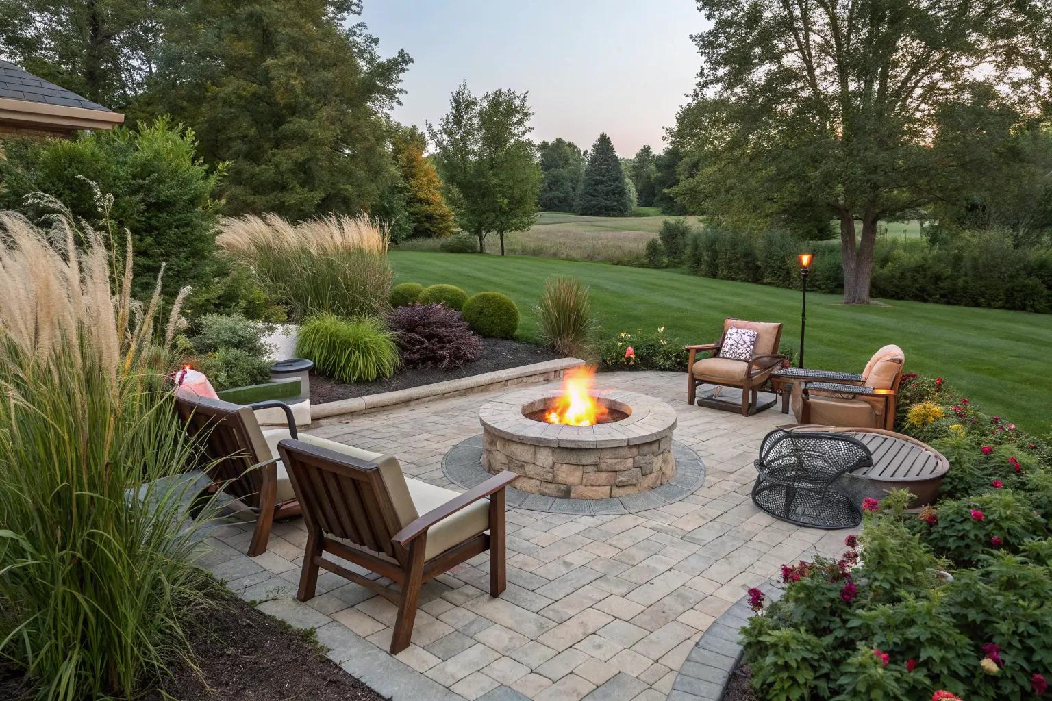 Create a welcoming circular firepit using stone pavers, perfect for intimate gatherings. I once helped a friend design this setup, and it became the ultimate spot for late-night chats.